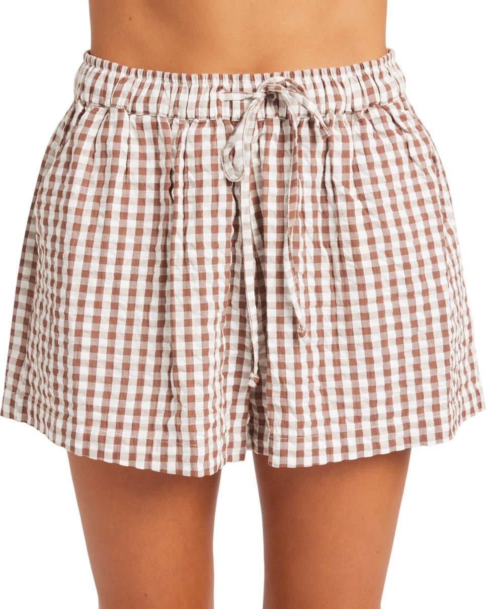 Island Soul Delilah Check Shorts — กางเกงขาสั้นลายตารางสุดชิค ผ้าฝ้าย 100% เบา สบาย ใส่ได้ทุกโอกาส เพิ่มความเก๋ด้วยดีเทลเหรียญโลโก้ Roxy
