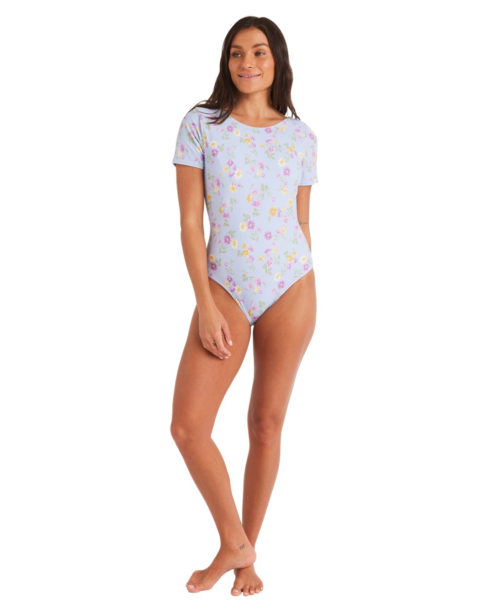 Wild Flower S/S Onesie — a sweet yet cool short-sleeve onesie made from soft, stretchy recycled fabric, offering flexibility, comfort, and ready for every beach day adventure.